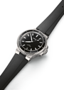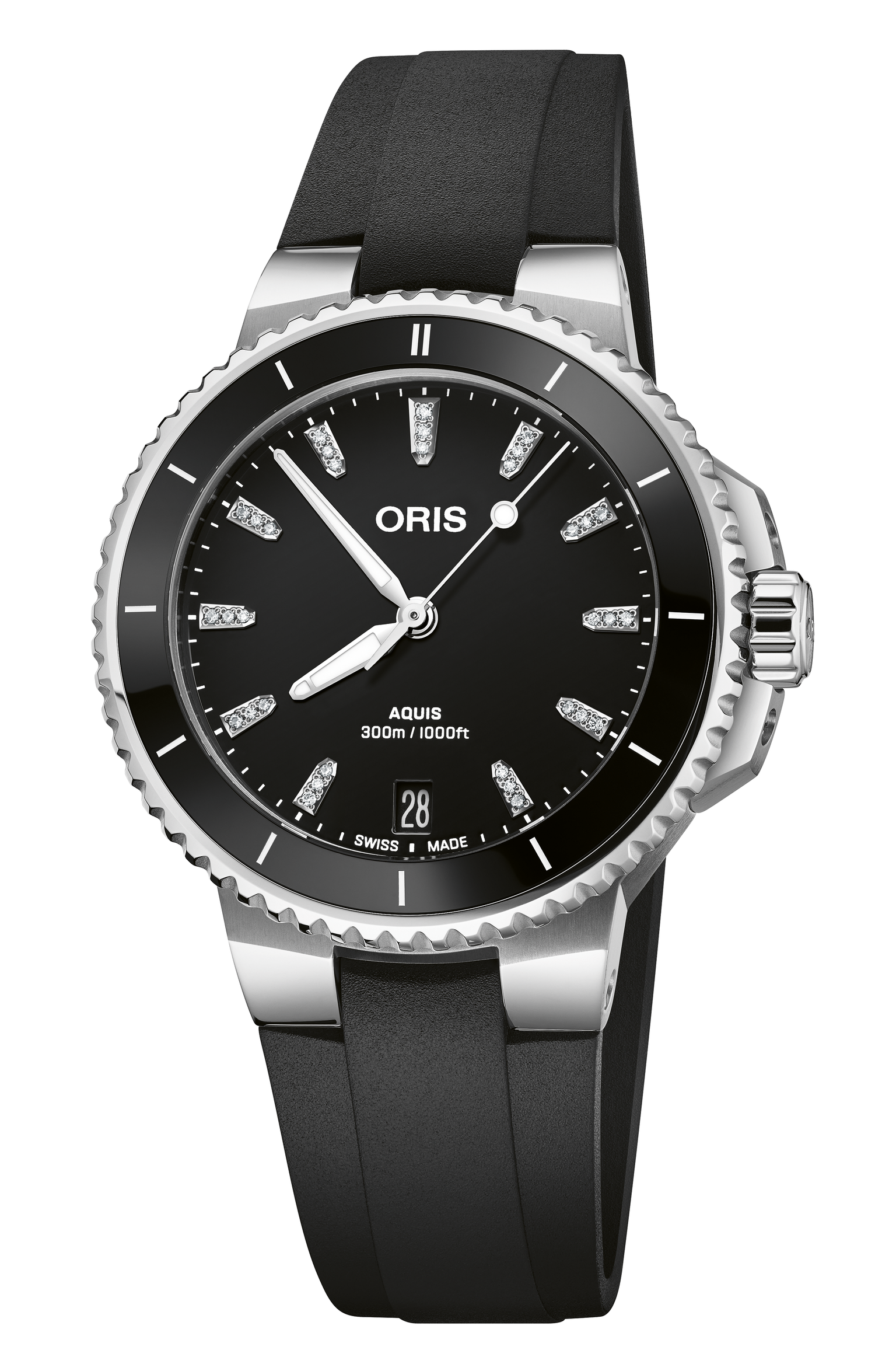 In this Aquis Date Diamonds timepiece, you’ll find 11 indices each set with three brilliant-cut diamonds, set on a black dial with a matching rubber strap with a folding clasp. The watch features a unidirectional rotating black ceramic bezel, a lumed lollipop running seconds hand, a corrosion-free stainless-steel case housing an automatic movement visible through the screwed see-through mineral glass case back, and a screw-down crown with protection making the watch water resistant to 30 bar (300 meters).