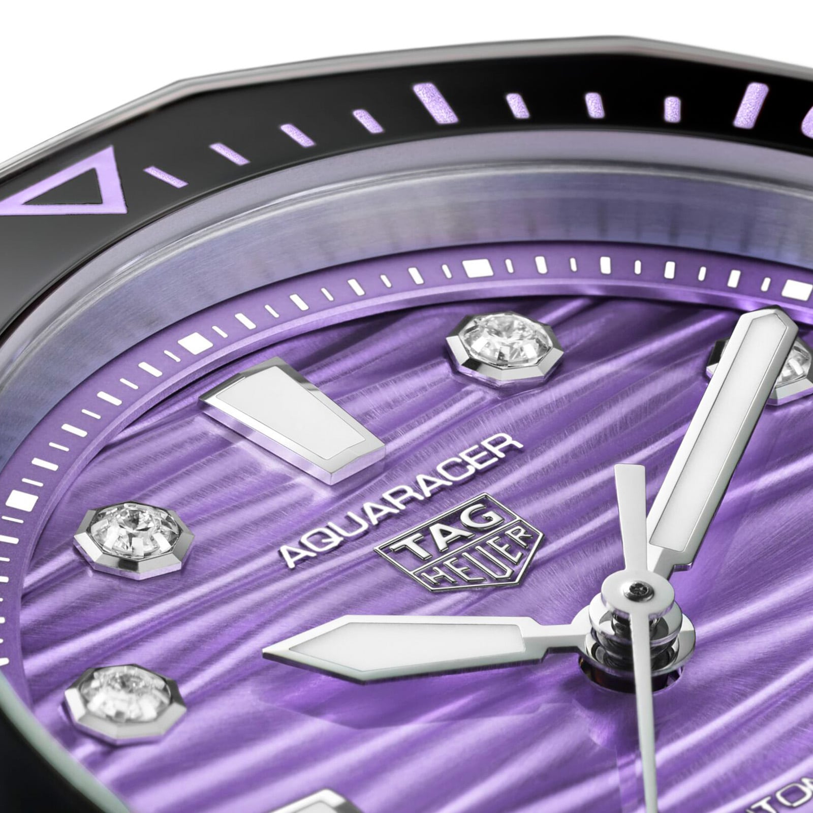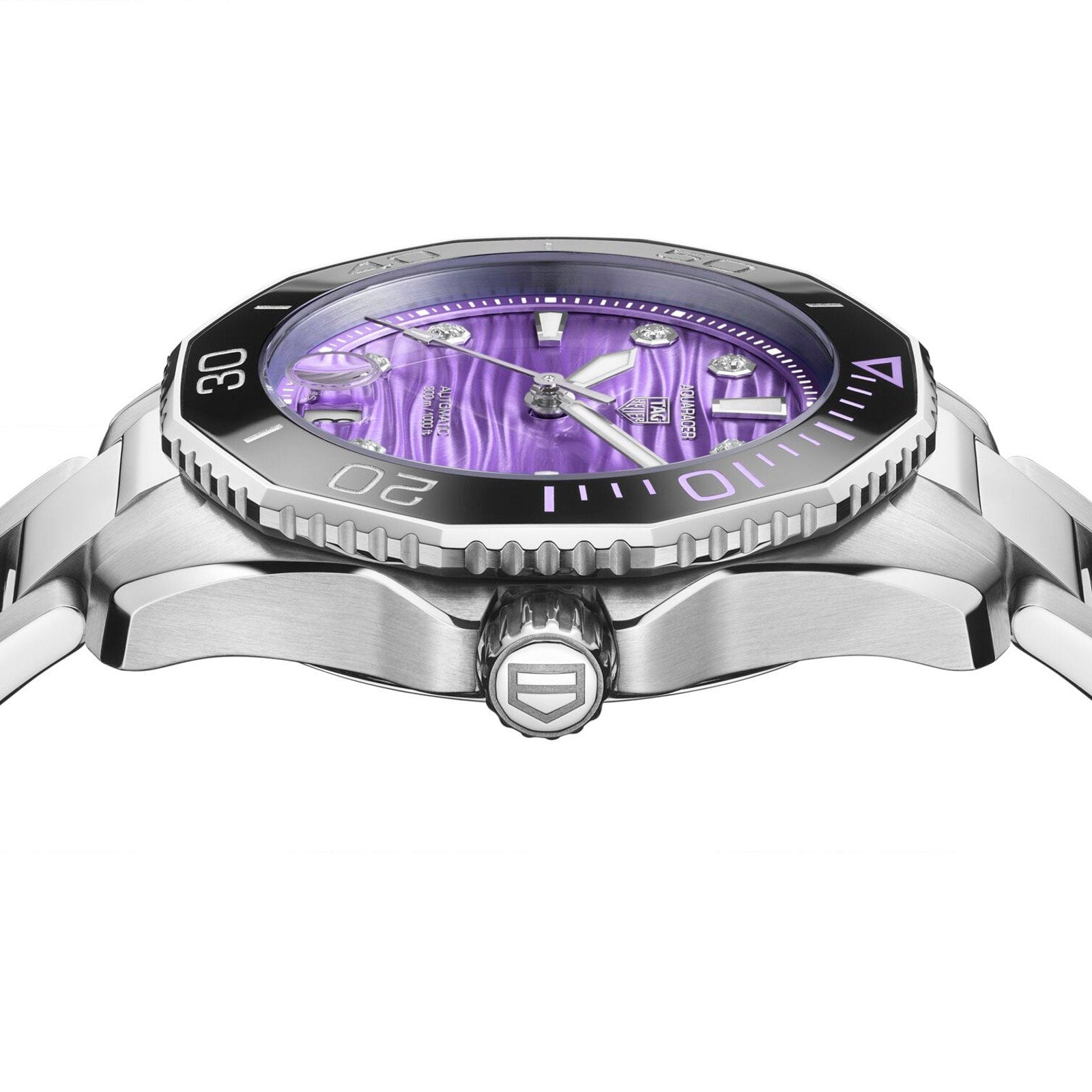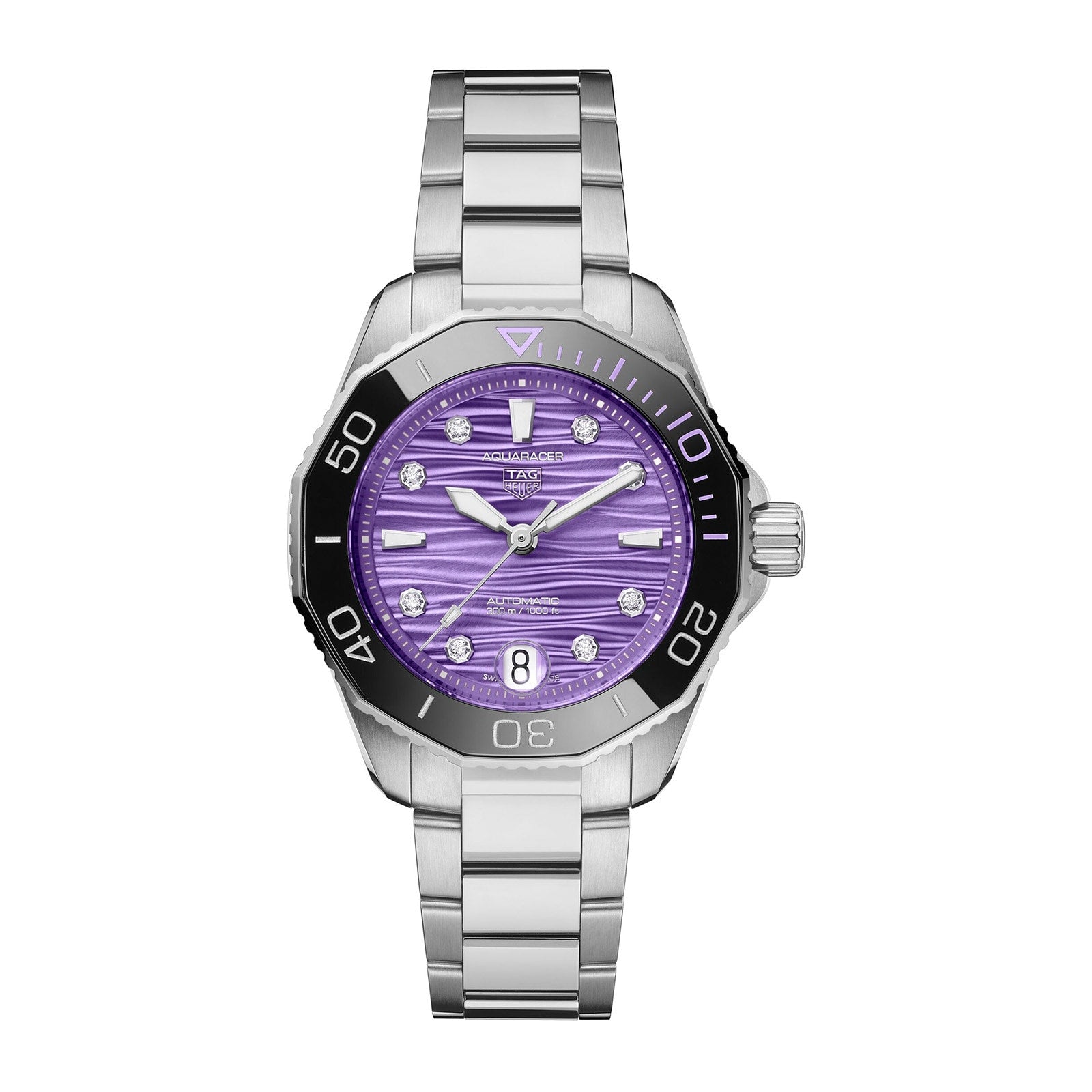 Drawing inspiration from vibrant coral reef ecosystems, the TAG Heuer Aquaracer Professional 300 Date showcases a captivating purple dial enhanced with brilliant diamond details. This exceptional timepiece seamlessly blends sophisticated elegance with robust performance capabilities, making it equally impressive beneath the waves as it is during everyday wear. Perfect for those who demand both luxury and reliability in their diving companion.