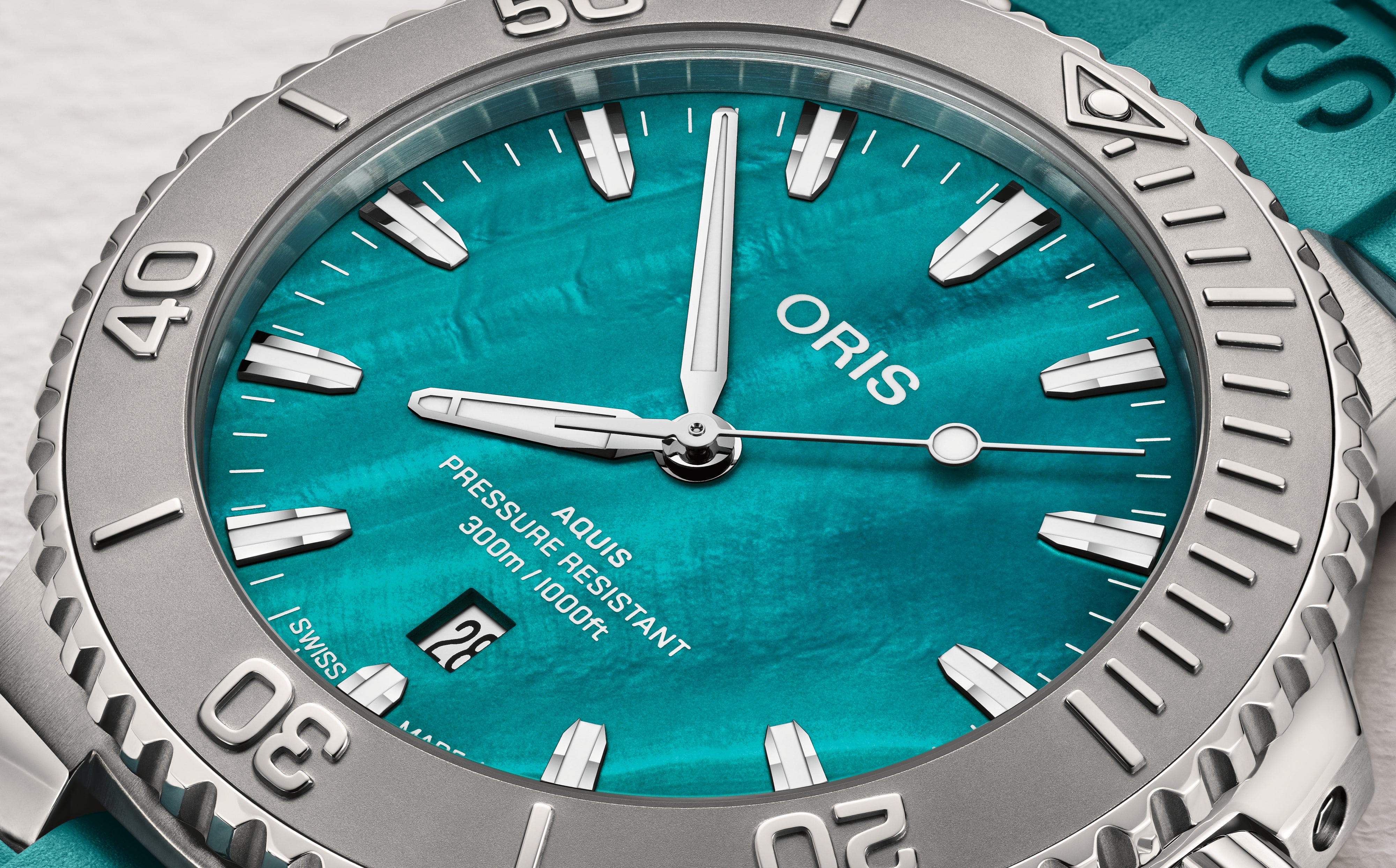 Oris celebrate s its partnership with the Billion Oyster Project and New York City through the New York Harbor Limited Edition II, a distinctive 2, 000-piece release of the Aquis Date dive watch. Crafted with a robust 43.5 mm stainless steel case and uni-directional bezel, it fea tures an aqua green mother-of-pearl dial illuminated by Super-LumiNova® hands and markers for clear visibility underwater. Equipped with a reliable Oris Calibre 733 automatic movement, this watch offers a 41-hour power reserve, a date function, and waterproof capa bilities up to 300 meters. With both a stainless steel bracelet and an extra aqua green rubber strap, it blends style, durability, a nd functionality for the discerning adventurer.
