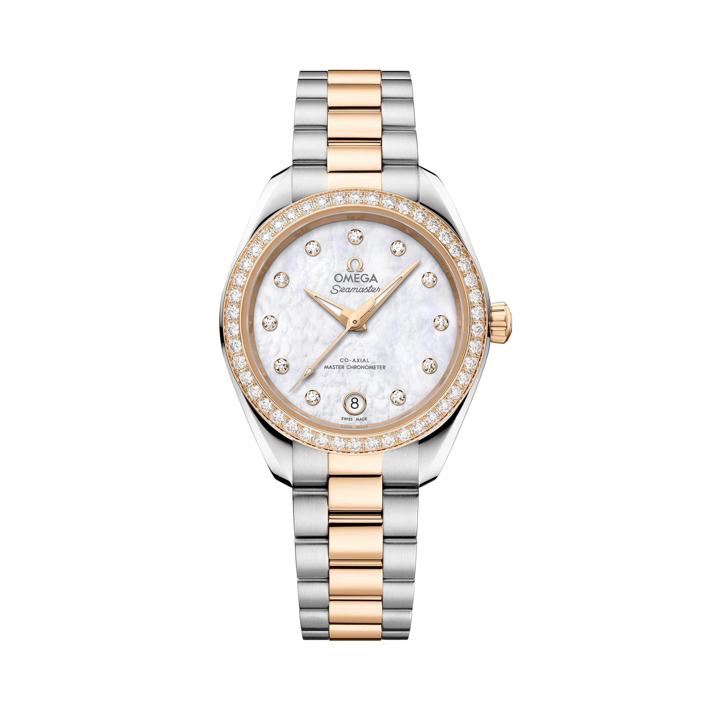 OMEGA Seamaster Aqua Terra 150M 30mm, Moonshine™ gold on Steel Watch, with a Diamond Bezel and Mother-of-Pearl Dial with Diamond Markers on a Moonshine™ gold on Steel integrated two-tone bracelet.