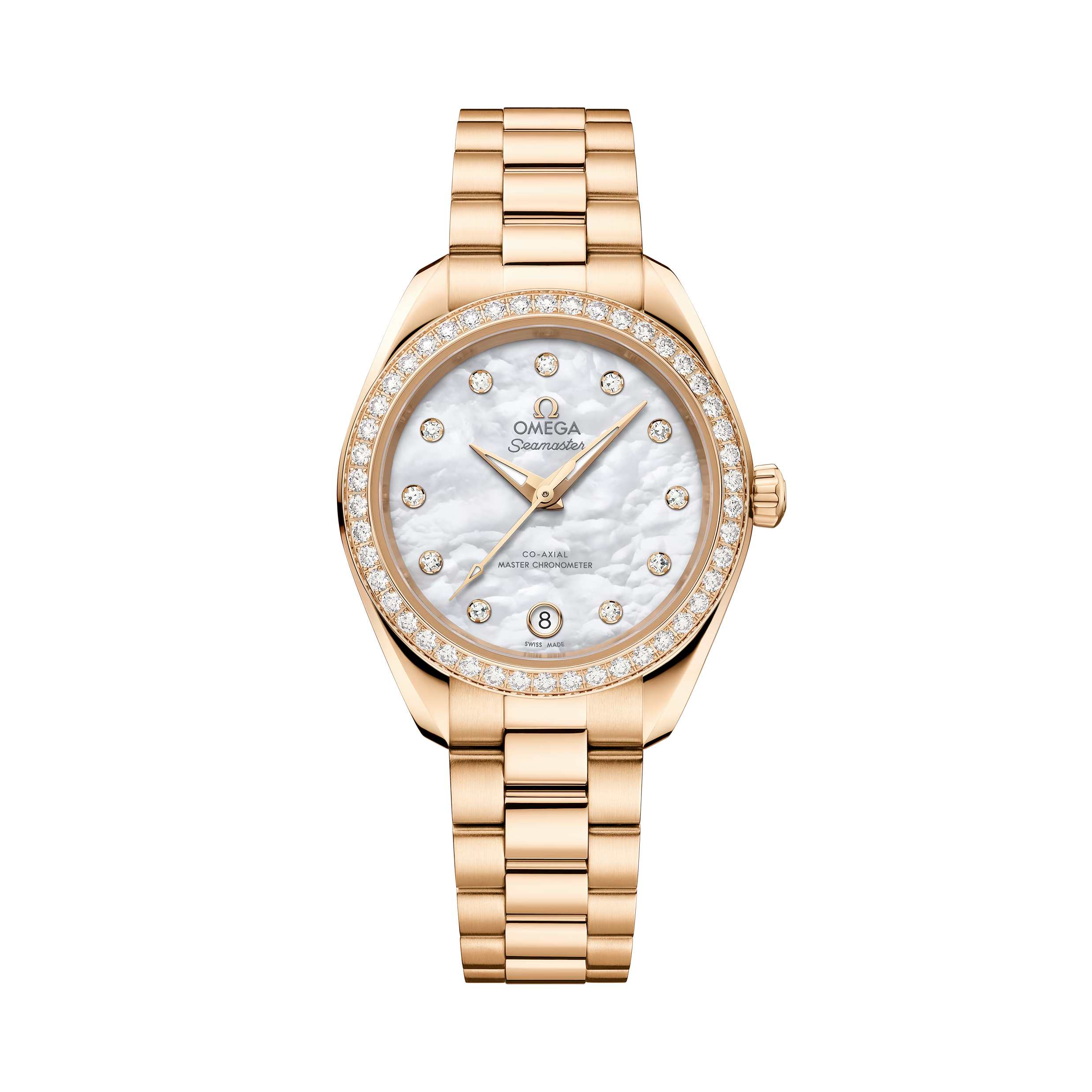 OMEGA Seamaster Aqua Terra 150M 30mm, Moonshine™ gold on Moonshine™ gold Watch, with a Diamond Bezel and Mother-of-Pearl Dial with Diamond Markers on a Moonshine™ gold integrated bracelet.