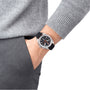 A person in a gray sweater and pants has their hand in their pocket, showcasing the Zenith Pilot Big Date Flyback—a black and silver pilot watch with an analog face and sleek black ceramic case.