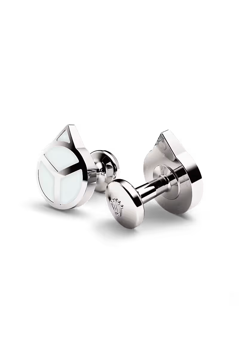 These cufflinks bring together several signature elements of Rolex watches. In the centre, the five-pointed crown is engraved on a Cerachrom disc in ceramic, which is surrounded by fluting that evokes the emblematic bezel seen on Classic Rolex models.
