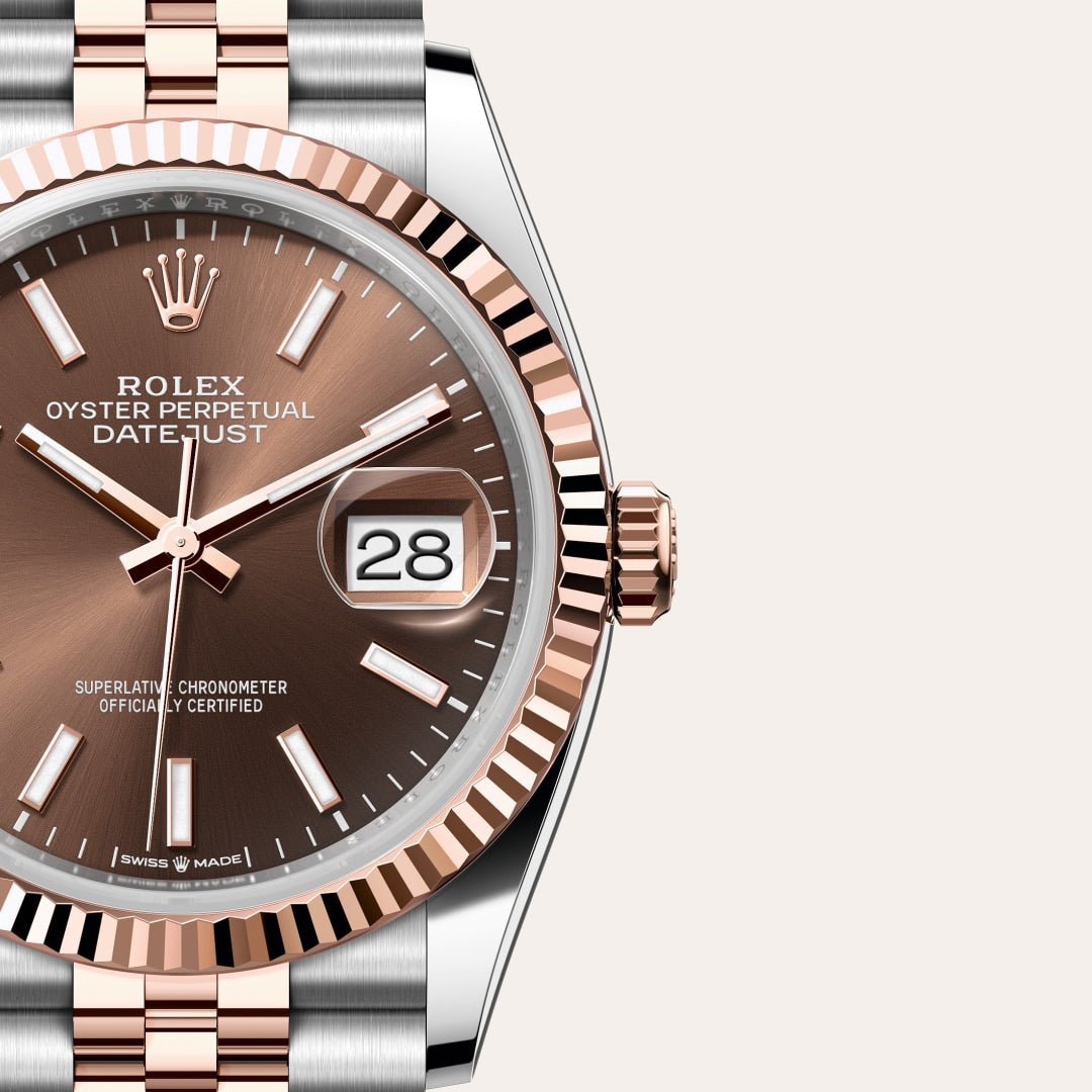 The Rolex fluted bezel is a mark of distinction. Originally, the fluting of the Oyster bezel had a functional purpose: it served to screw the bezel onto the case helping to ensure the waterproofness of the watch. It was therefore identical to the fluting on the case back, which was also screwed onto the case for waterproofness, using specific Rolex tools. Over time, the fluting became an aesthetic element, a genuine Rolex signature feature. Today the fluted bezel is a mark of distinction, in gold on this Datejust 36.