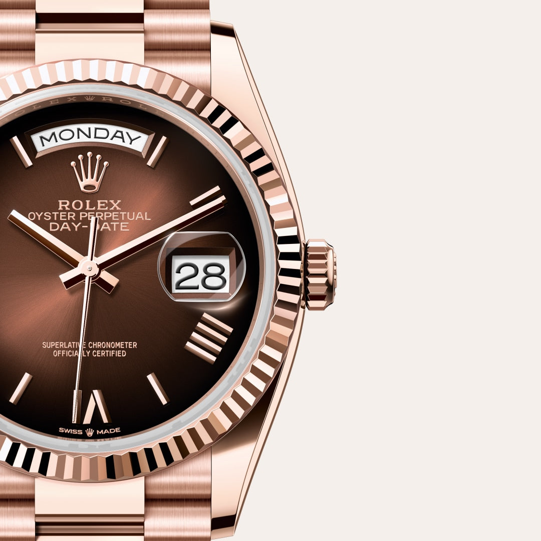 The Rolex fluted bezel is a mark of distinction. Originally, the fluting of the Oyster bezel had a functional purpose: it served to screw the bezel onto the case helping to ensure the waterproofness of the watch. It was therefore identical to the fluting on the case back, which was also screwed onto the case for waterproofness, using specific Rolex tools. Over time, the fluting became an aesthetic element, a genuine Rolex signature feature. Today the fluted bezel is a mark of distinction, in gold on this Day-Date 36.