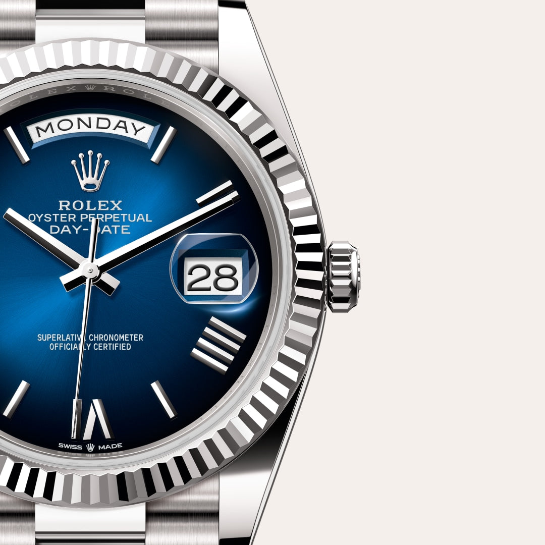 The Rolex fluted bezel is a mark of distinction. Originally, the fluting of the Oyster bezel had a functional purpose: it served to screw the bezel onto the case helping to ensure the waterproofness of the watch. It was therefore identical to the fluting on the case back, which was also screwed onto the case for waterproofness, using specific Rolex tools. Over time, the fluting became an aesthetic element, a genuine Rolex signature feature. Today the fluted bezel is a mark of distinction, in gold on this Day-Date 40.
