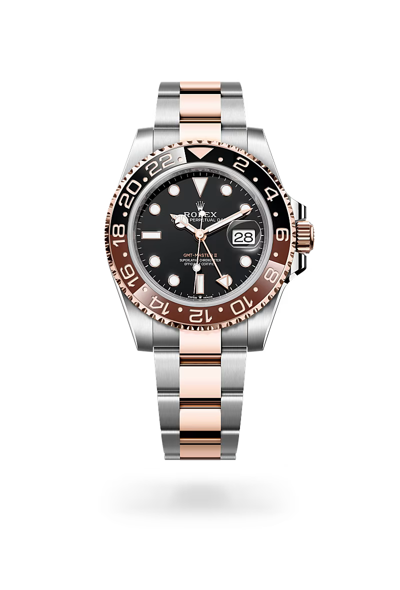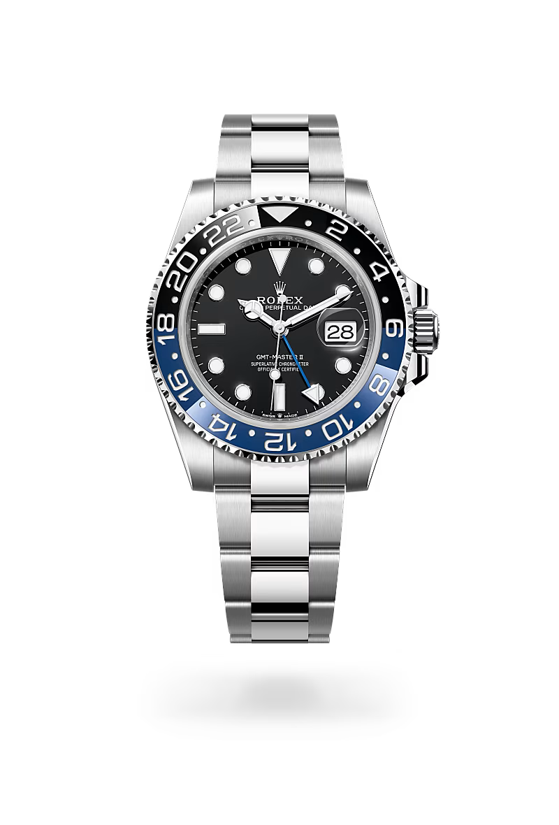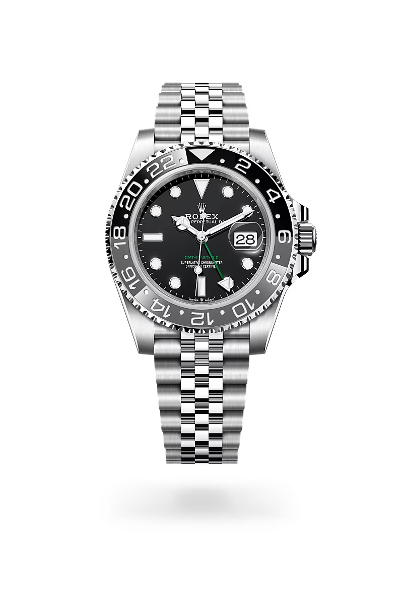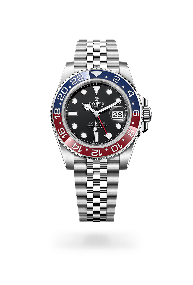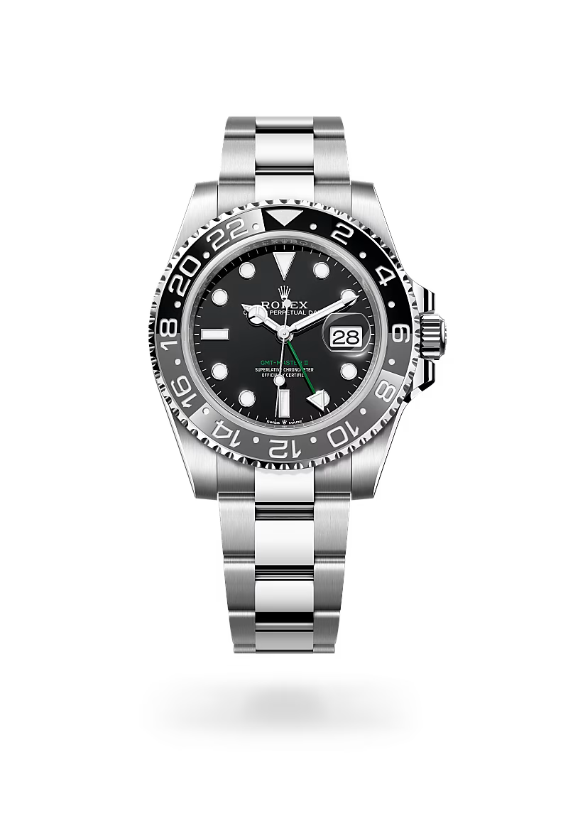 The GMT-Master II has an instantly recognizable design with a graduated bezel insert, which is available in various dual-colour combinations – the lower half symbolizing daytime and the upper signalling night-time. With traditional hour, minute and seconds hands, its triangle-tipped 24-hour hand and bidirectional rotatable bezel with a 24-hour graduated Cerachrom insert, the GMT-Master II can display the time in two time zones simultaneously: either the local time and the reference time, or the local time and that of an alternative time zone.