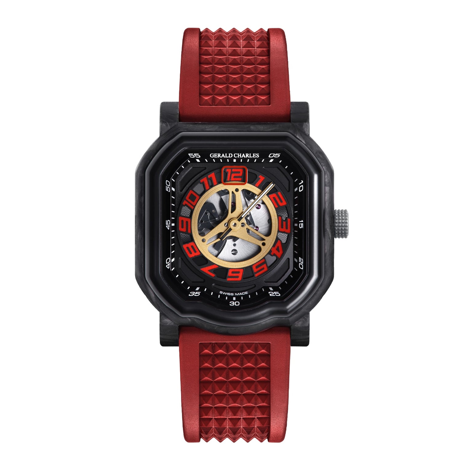 The Gerald Charles Maestro 4.0 Ducati 30° Anniversario 916 is a black and red wristwatch featuring a visible gold mechanism and a bold red rubber strap.