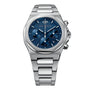 The Girard-Perregaux Laureato Chronograph 42 features a durable 904L steel case, octagonal bezel, blue textured dial with three sub-dials, silver hour markers, and a metal bracelet.