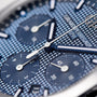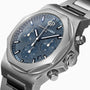 Close-up of the Girard-Perregaux Laureato Chronograph 42, highlighting its blue textured dial, octagonal bezel, subdials, silver hands, and prominent branding.