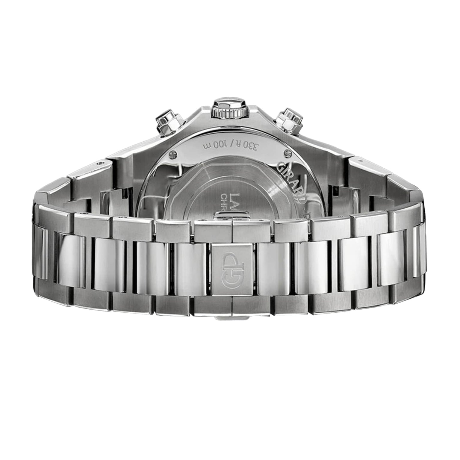Back view of the Girard-Perregaux Laureato Chronograph 42, featuring a 904L steel case, metal bracelet, visible clasp, and engraved markings on the case back.
