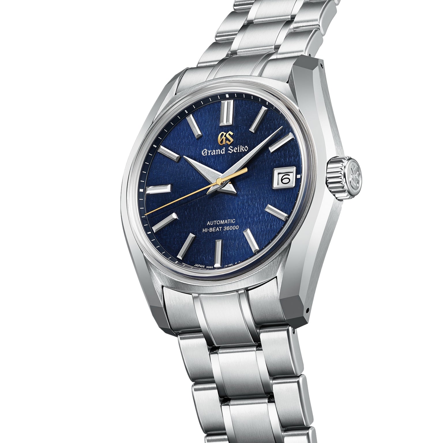 The Grand Seiko Hi-Beat Heritage is a stainless steel watch with Zaratsu polishing, a blue textured dial, silver markers, date at 3 o’clock, and the Hi-Beat Caliber 9S85 automatic movement.