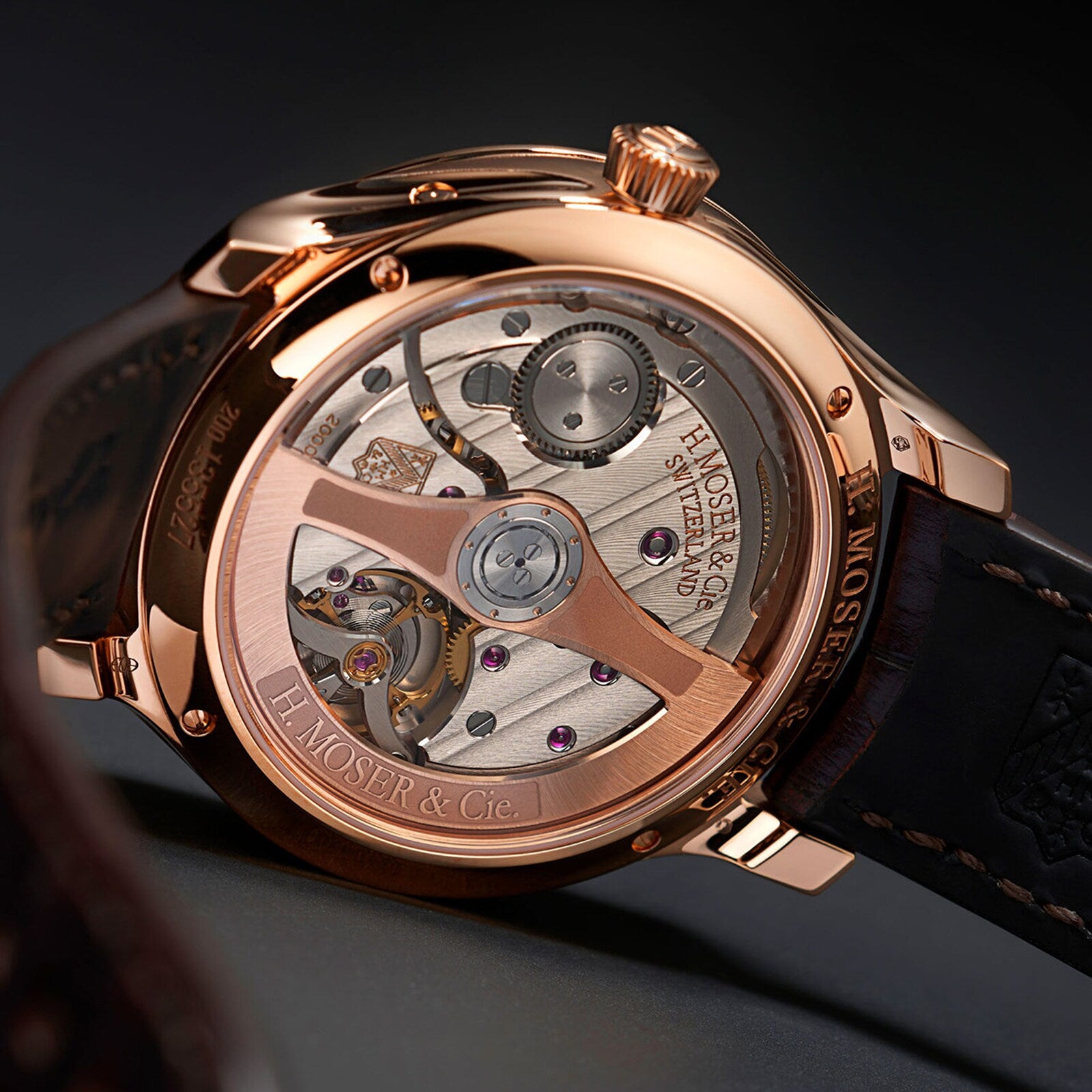 Close-up of the H. Moser & Cie Endeavour Chinese Calendar luxury watch, featuring an exposed rose gold mechanical movement and a brown leather strap.