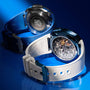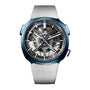 The H. Moser & Cie Streamliner Alpine Divers Edition features a skeleton dial, blue bezel, silver mesh strap, and showcases visible inner mechanics.