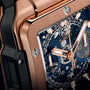 A close-up of the Hublot Square Bang Unico King Gold Blue watch displays its exposed mechanical movement through a transparent case back, highlighting its 18k King Gold craftsmanship.
