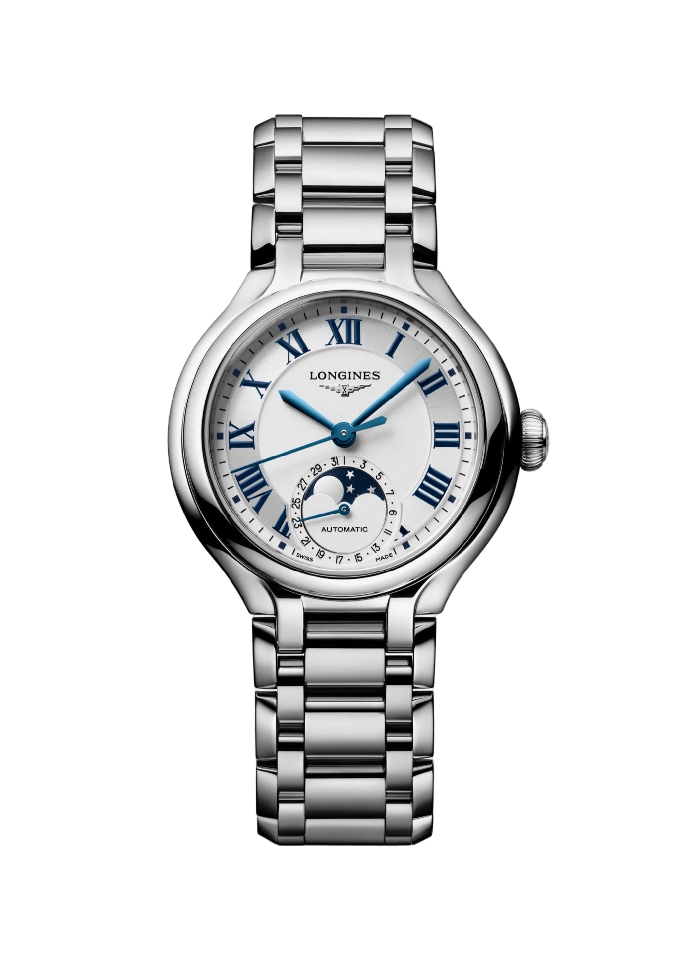 Longines introduces the reinvented PrimaLuna collection, perfectly blending timeless elegance with modern sophistication. This mo del showcases a refined 34-mm stainless steel case paired with a classic sunray silver dial accented by striking blue Roman numerals . Marking a first for PrimaLuna, the automatic moonphase complication now includes a convenient date display, driven by Longines’ e xclusive L899.5 automatic calibre featuring advanced silicon balance spring technology. The crown’s rounded design mirrors a full mo on, adorned with crescent moon engravings that deepen its celestial charm. Completed with a redesigned stainless steel bracelet of s mooth half-moon links, this watch is a captivating fusion of beauty and function.