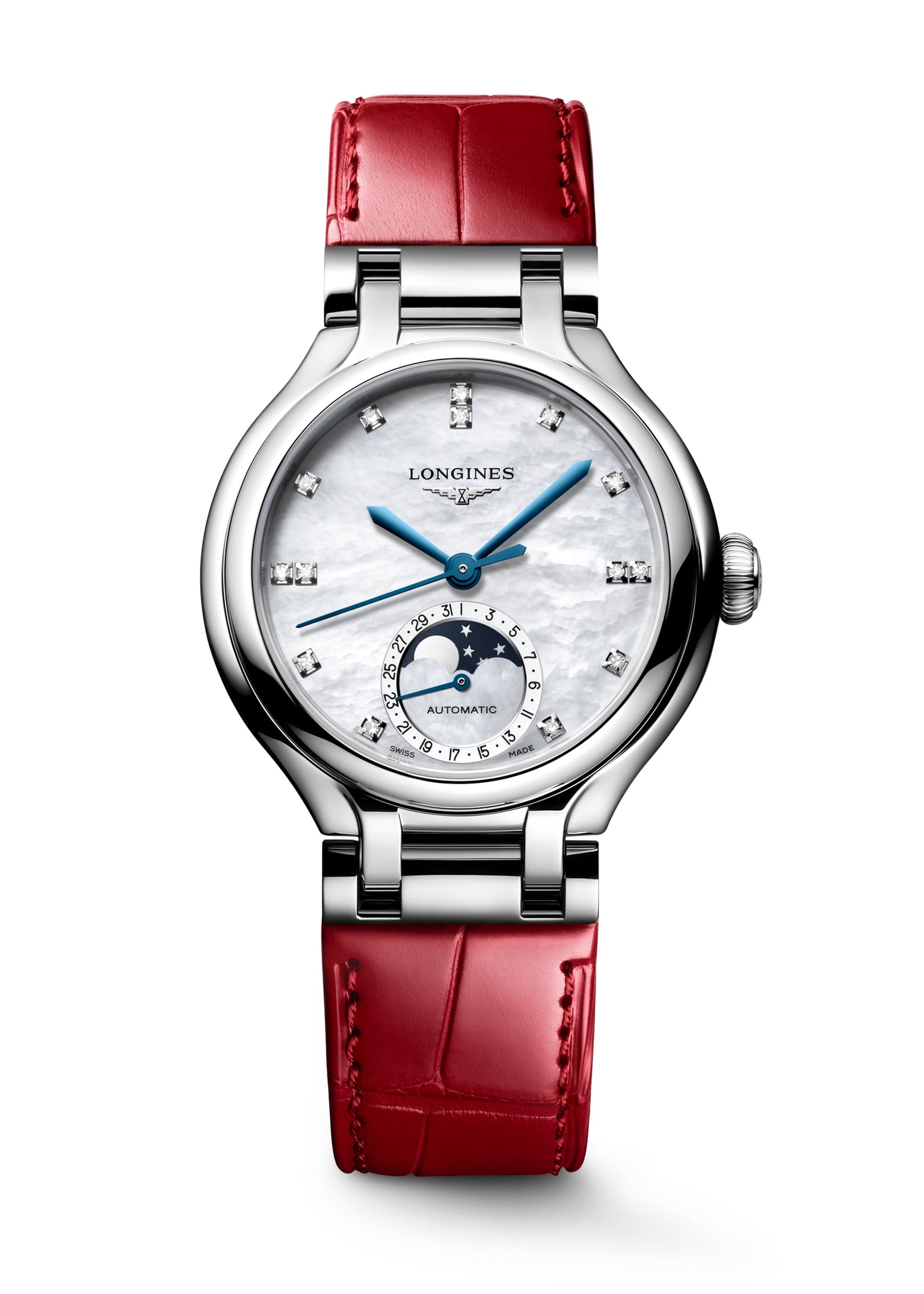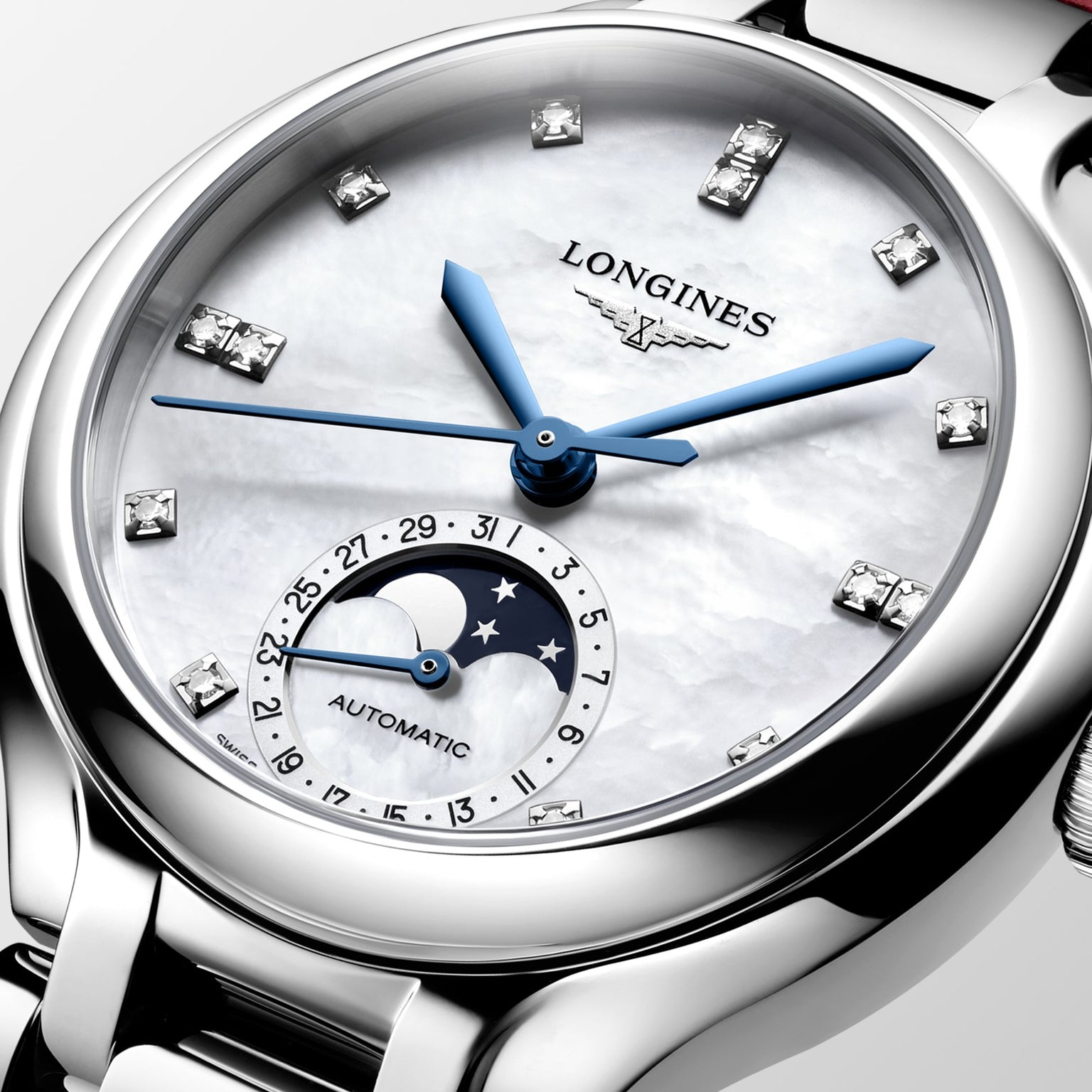 This watch features a reimagined 34-mm stainless steel case and has a white mother-of-pearl dial adorned with 14 diamond indexes.