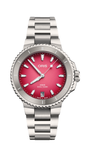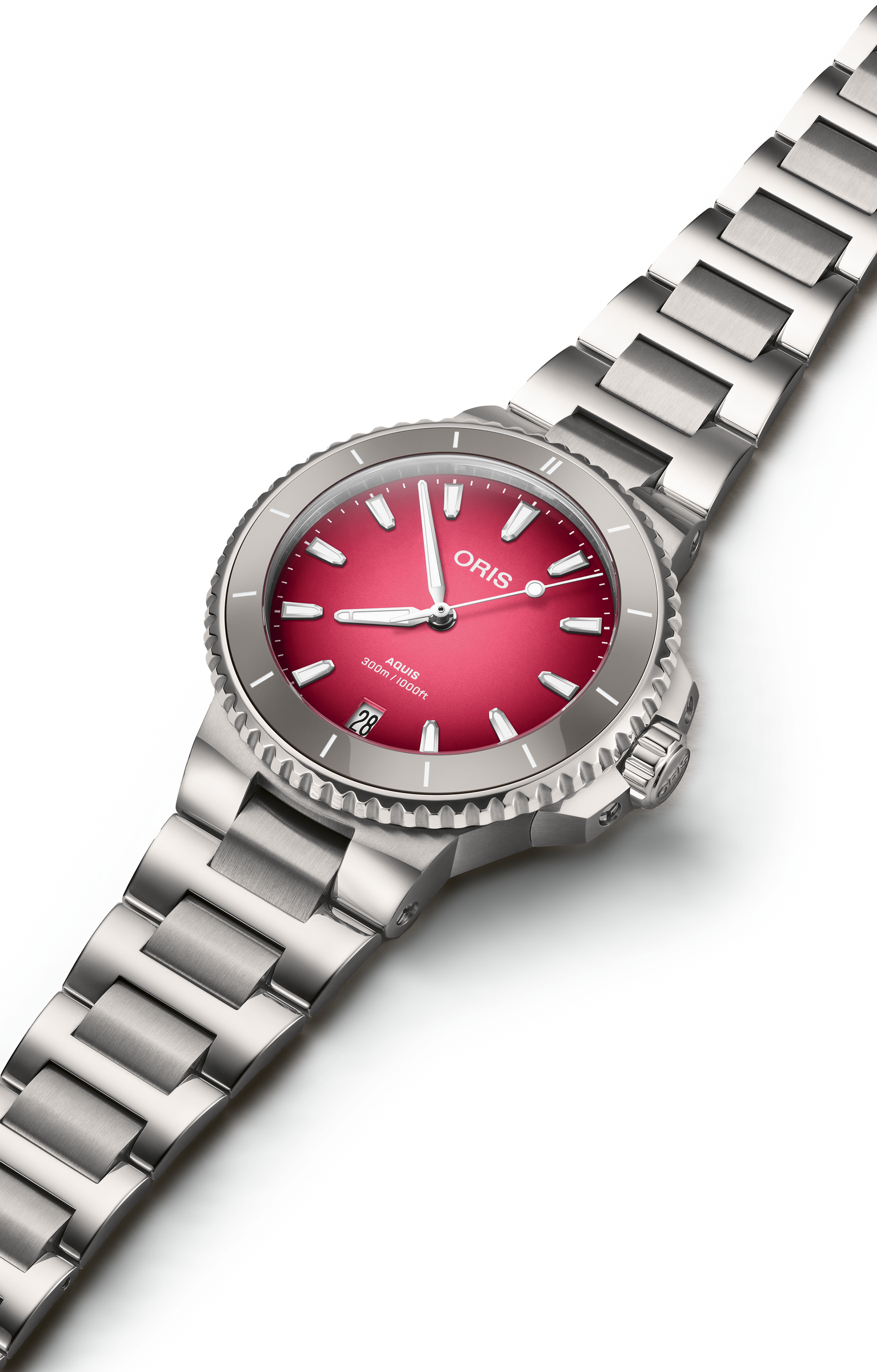 Back by popular demand! Meet this Aquis Date “Taste of Summer” 36.50 mm with a gradient sunrise red-pink dial, inspired by the striking colors of a Hölstein summer in the Waldenburg Valley where Oris watches are made. The winters are long in the Swiss mountains, and so when spring arrives, giving way to the verdant, sweet-scented Alpine summer, a ray of warmth floods the Oris factory. The Taste of Summer captures that feeling.