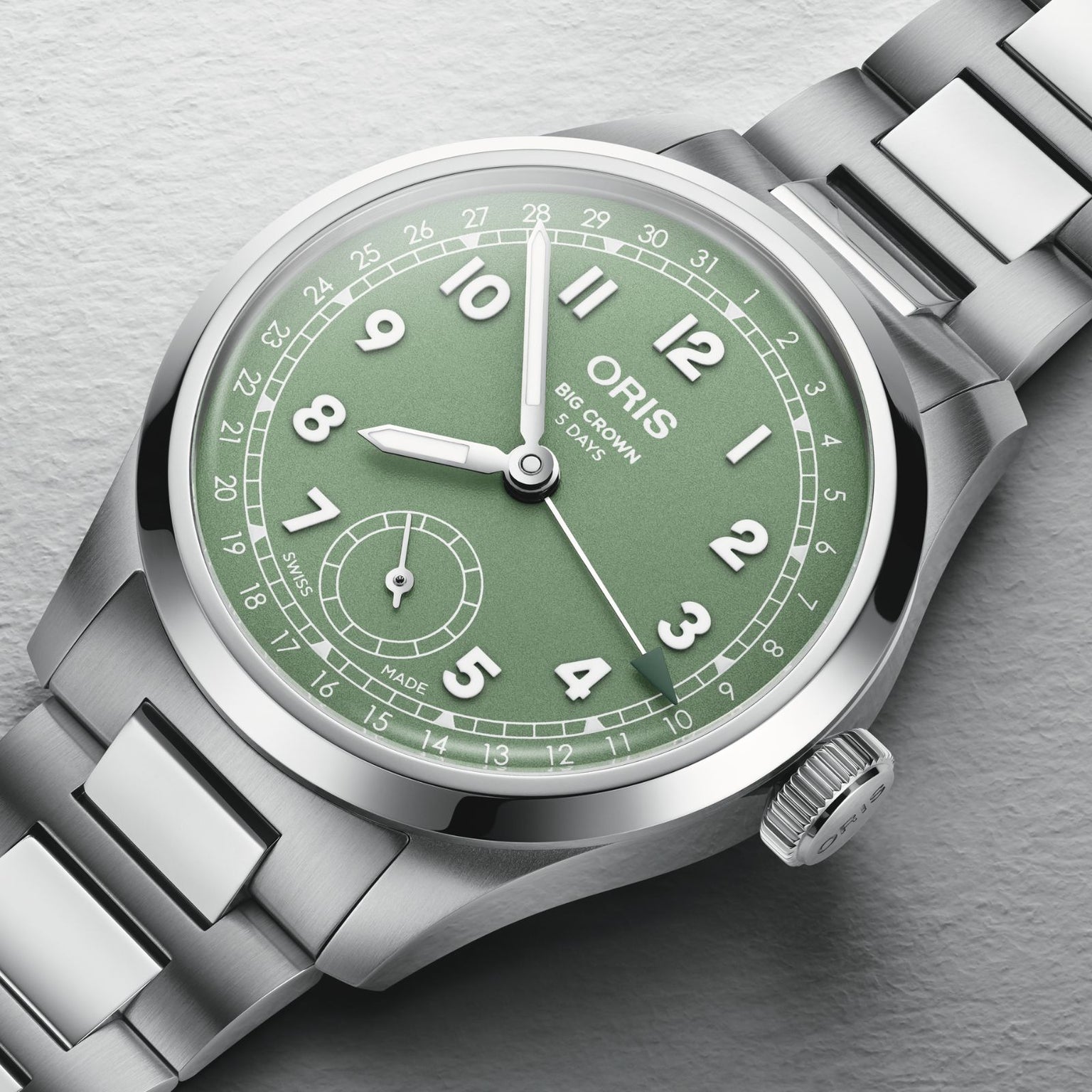 The story of the Big Crown Pointer Date is the stuff of Oris legend. Its genesis began in the 1930s when Oris was a fast-growing independent company, known around the world for its precision wristwatches. The brief was to produce a watch that would serve a new clientele with very specific needs. For pilots, a watch would need to be as precise and reliable as any, but it would also need to be easy to use and read. Cockpits were uncomfortable places: cramped, hard, often cold, and always unforgiving. Oris’ solution was to produce a simple round watch in a stainless steel case, with a black dial and large Arabic numerals at 12, 3, and 9, and an oversized crown that could be gripped by a gloved aviator. It would also feature a date complication, indicated by a central hand with a red arrow tip. This way, it would be functional and legible, a toolwatch for one of the most demanding jobs imaginable. Little would its creators have known, but their practical, high-functioning watch of 1938 would become a design staple, one of the most recognizable watches in all of watchmaking. Today, almost 90 years since that first release, the Big Crown Pointer Date – as it’s become known – is our signature design and a Swiss watchmaking icon.