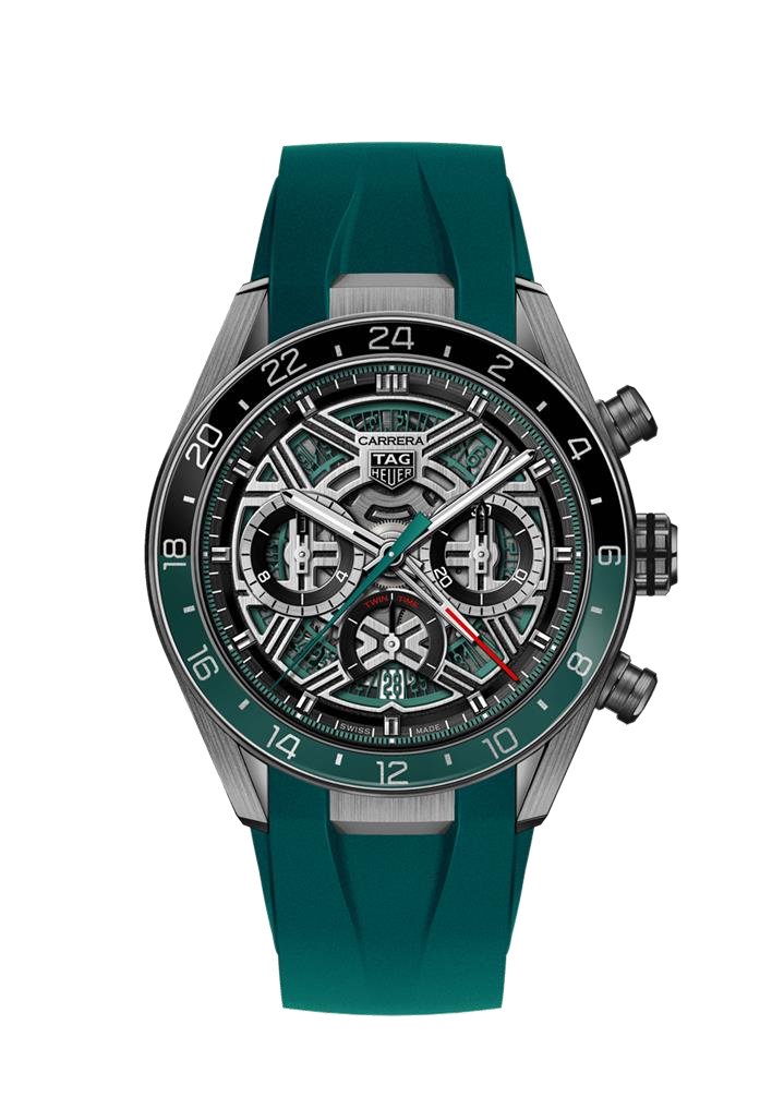 The TAG Heuer Carrera Chronograph Extreme Sport (44mm) honors the Carrera tradition by integrating advanced materials with striking design elements. Created for motorsport enthusiasts, it combines exacting craftsmanship with a bold, high-energy style, making it the ideal companion for pushing boundaries both on and off the track. This model reimagines the Extreme Sport GMT with inspiration drawn from sports cars and the intricate GMT complication. Featuring the advanced TH20-02 in-house GMT chronograph movement and a new signature teal green accent, it establishes a fresh hallmark within the Carrera collection.