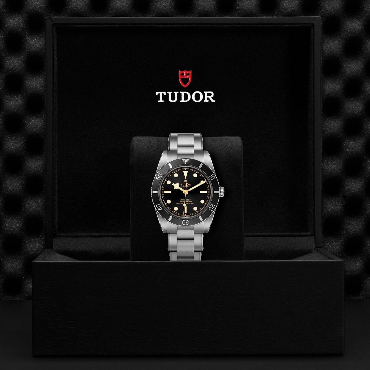 A TUDOR Black Bay 54 dive watch with a black dial and stainless steel band is displayed upright in a black, Tudor-branded presentation box.