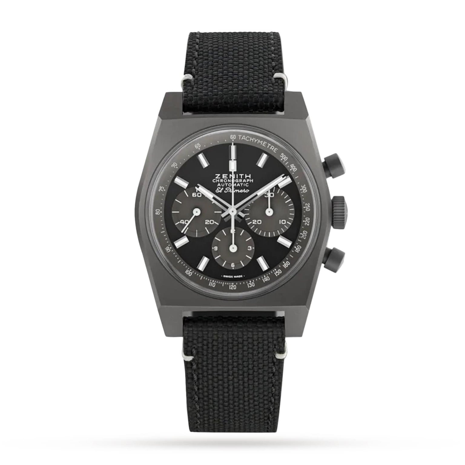 The Zenith Chronomaster Revival Shadow is a black chronograph wristwatch with a matte titanium case, three subdials, white markers, and a black fabric strap, shown against a plain white background.